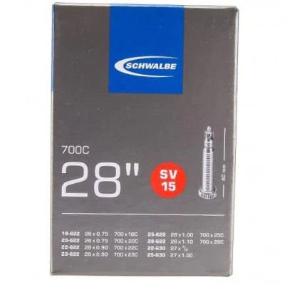 Las cámaras Schwalbe de 700 están disponibles en gran variedad de medidas y son adecuadas para su uso en carretera, ciudad, trekking, gravel e incluso MTB. Estas cámaras son resistentes y tienen una excelente relación calidad-precio-peso, perfectas para llevar de repuesto en sus salidas y rutas.En caso de pinchazo le recomendamos repararla usando un kit de parches, y siempre llevar una mini bomba en su bici o mochila, así como un juego de desmontables que le facilitarán solucionar la avería.
